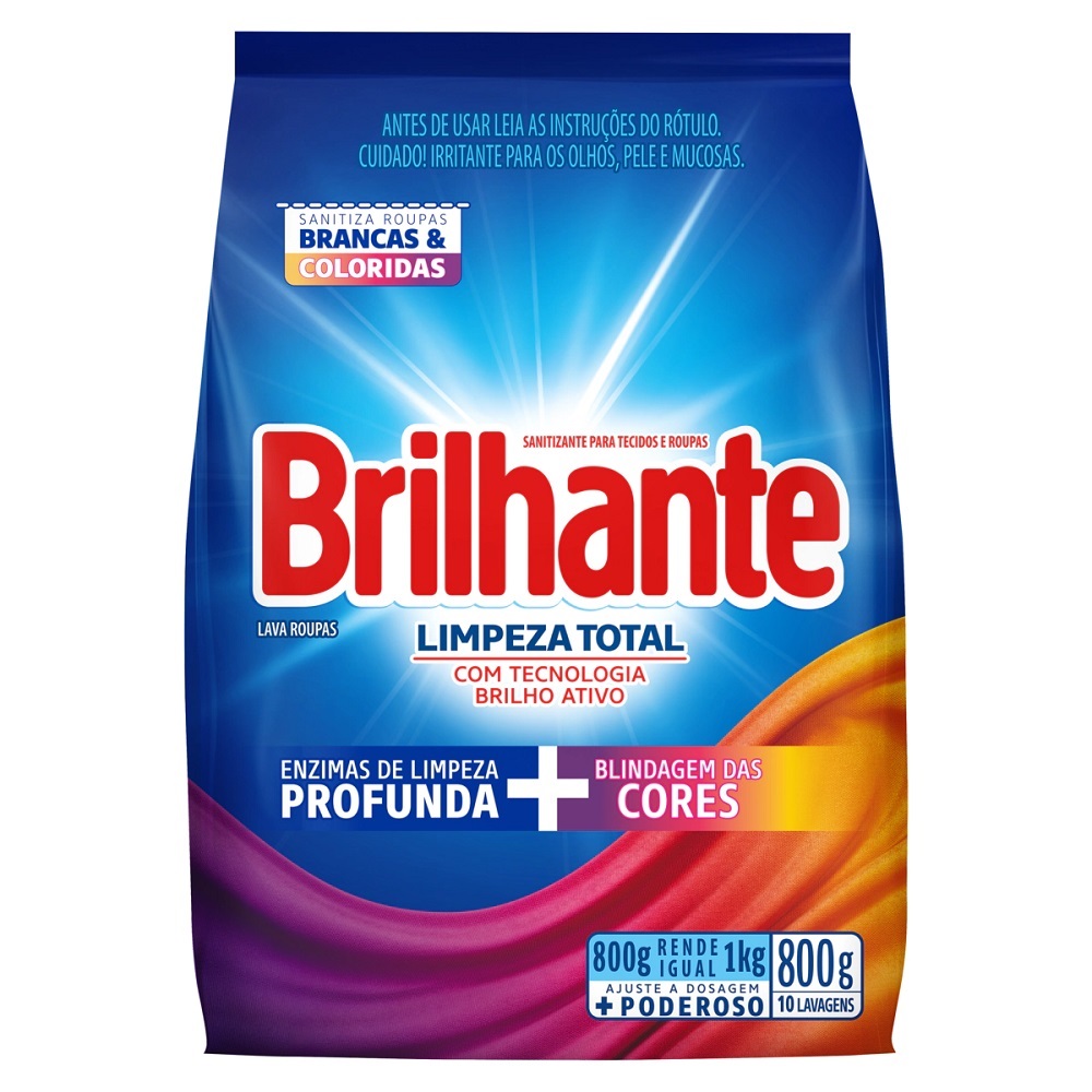 O novo sabão em pó Brilhante Limpeza Total limpa as roupas brancas e coloridas enquanto cuida das cores. A nova fórmula contém o poder das enzimas, proporcionando uma limpeza profunda e evitando que a sujeira se deposite novamente nas roupas.