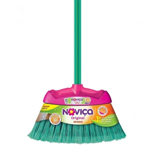 A Vassoura Noviça Original tem cerdas com tecnologia Multiuso Duo, Disposição das cerdas em leque, maior poder de varrição, acompanha cabo de metal.